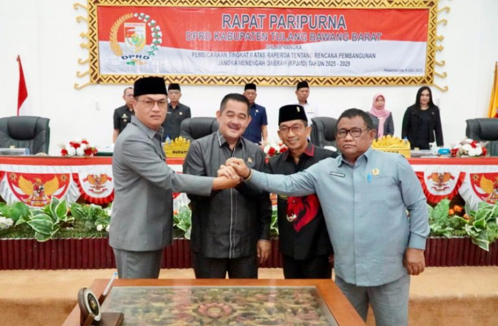 TUBABA LAMPUNG_DPRD Kabupaten Tulang Bawang Barat (Tubaba) melaksanakan rapat paripurna (DPRD) dalam rangka pembicaraan tingkat II atas persetujuan bersama Rancangan Peraturan Daerah (Ranperda) tentang Rencana Pembangunan Jangka Menengah Daerah (RPJMD) Kabupaten Tulang Bawang Barat tahun 2025–2029. Rapat berlangsung di Ruang Sidang Kantor DPRD setempat, Rabu (9/7/2025).